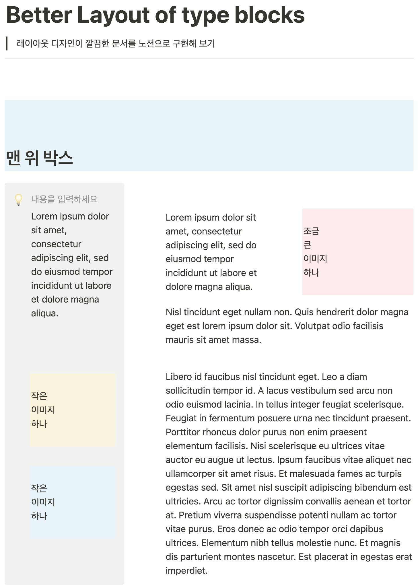 오른쪽 노션 문서를 살펴보자. 필자가 직접 구현한 두 가지 레이아웃인데, 하나는 정리되지 않은 혼란한 레이아웃이고 다른 하나는 깔끔하게 정리된 레이아웃이다. 노션으로 이 모든 것이 구현 가능한데, 작성자의 의도대로 쉽게 레이아웃을 만들 수 있는 것이 바로 노션의 장점이다. 자유도가 높은 만큼 글쓴이 입장에서 깊은 고민을 통해 자신만의 멋진 레이아웃을 완성해 보자.